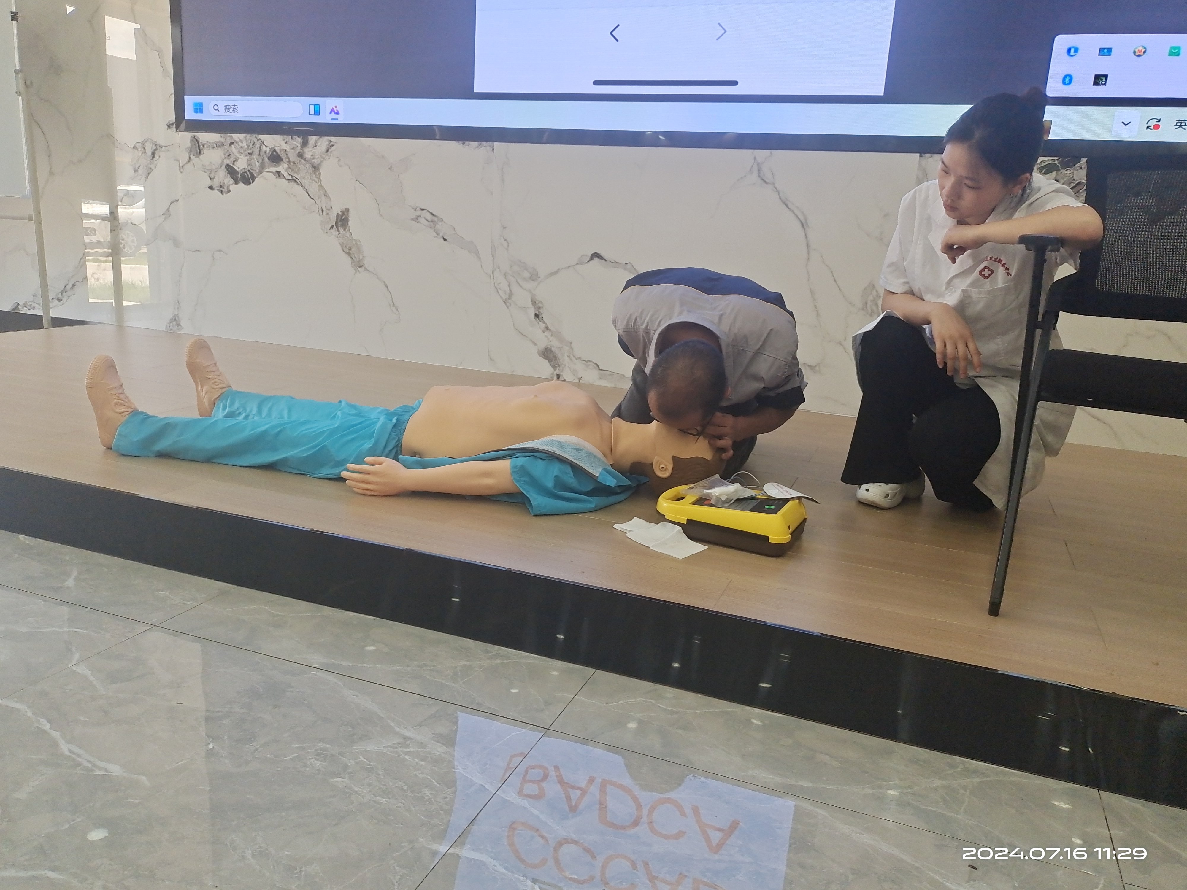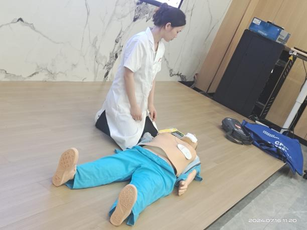 培训分为“心肺复苏及AED的使用”和“了解海姆立克急救法”两个部分。医师使用假人当场示范心肺复苏完整流程,给员工留下了深刻印象。通过情景模拟,向员工们展示了如何运用海姆立克急救法有效应对气道异物梗阻。活动现场,员工们积极参与互动,在医师的指导下有不少员工积极参与上台尝试进行心肺复苏、使用AED,现场气氛活跃。